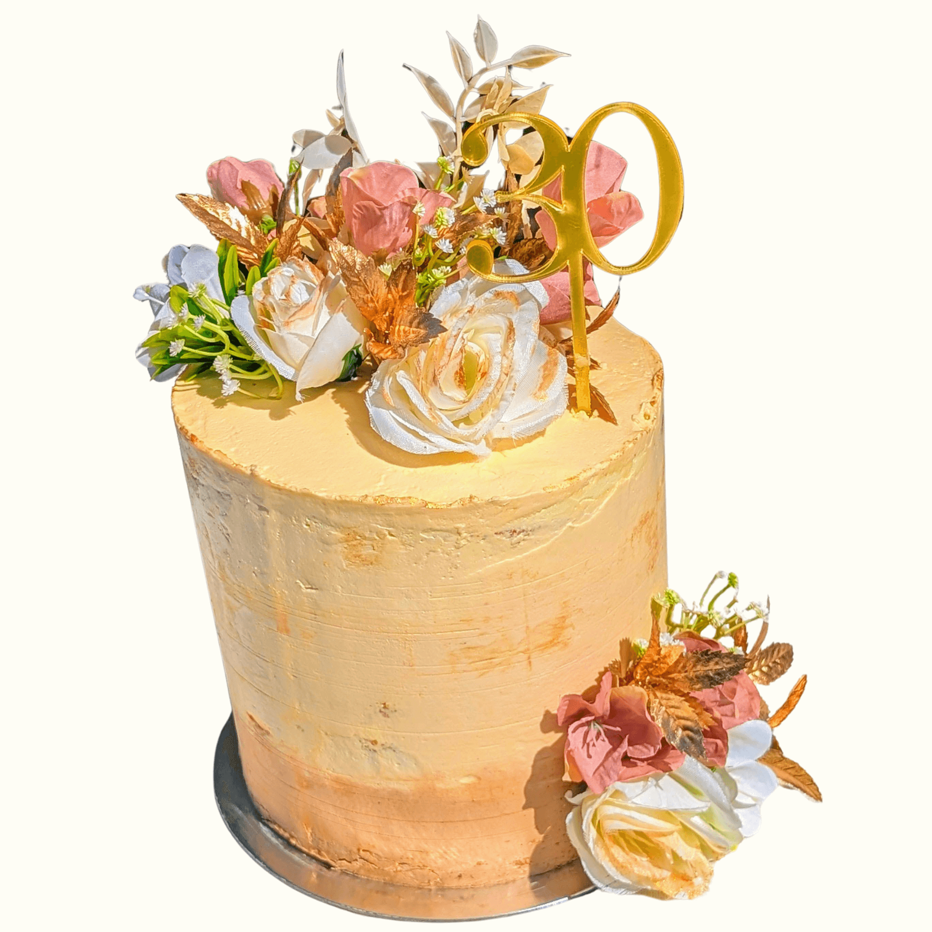 This elegant, tall event cake features a light vanilla sponge layered with silky buttercream. At 8 inches in diameter and 5 inches high, it serves approximately 25–30 guests — perfect for birthdays and anniversaries. The cake is adorned with tasteful artificial flowers and includes a customizable number holder for ages or milestone markers. Customers can order the cake as pictured or message us for bespoke customisations (extra charges may apply).